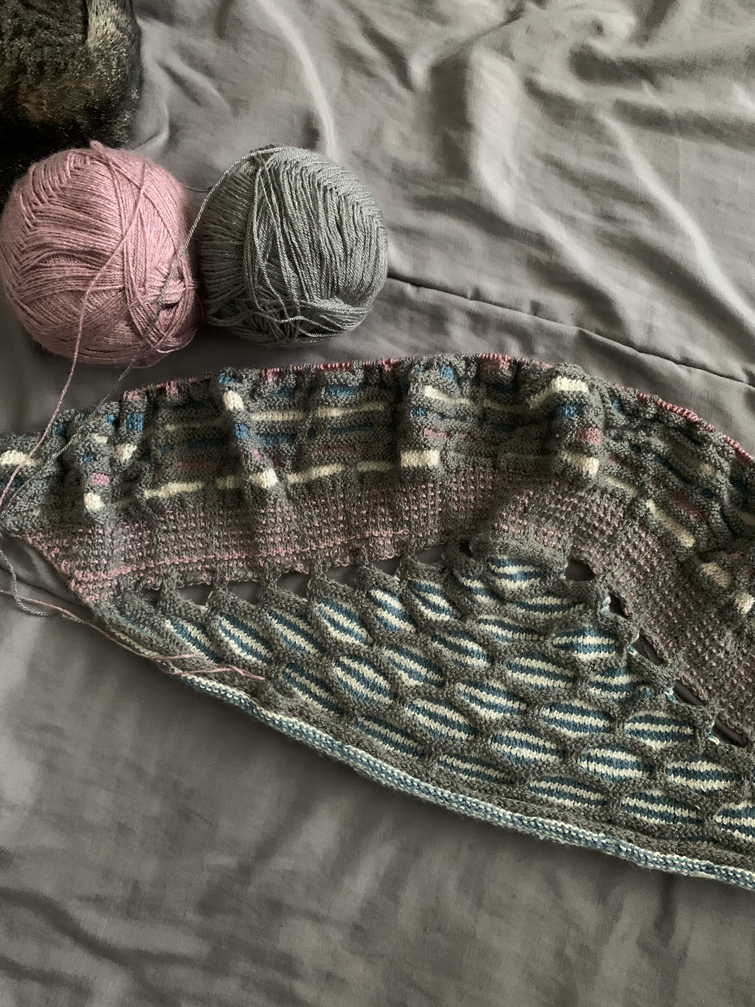 This is another cardigan where I finished the back and I’m working on a front panel. This one is my morning knit so I was also able to start and finish the first front panel this month. I didn’t take a picture of it though because it very badly needs to be blocked but I’m not going to do that until I’m done knitting all the pieces. My goal for next month is to finish this panel, the pockets and one sleeve. My ambitious goal is to finish all the pieces so I can stitch it altogether.