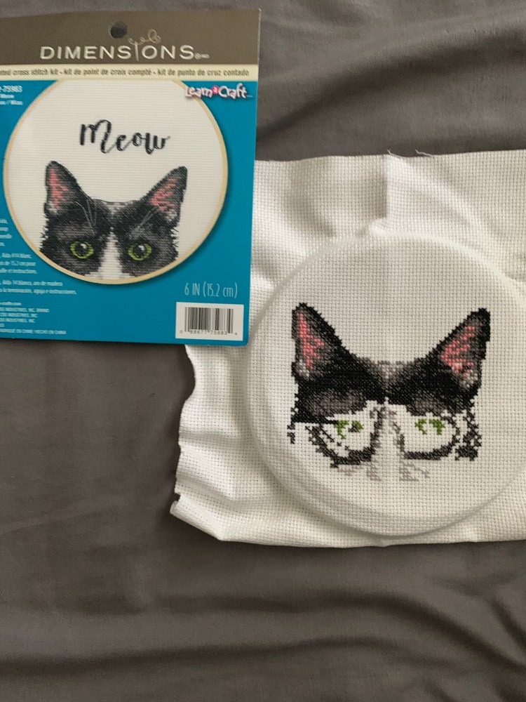 She is so close to being done! I worked on this one three days last month and I love that her face is so clear now. I just need to finish filling in the middle of her face and backstitch all the details in. And of course do the word Meow. I’m not sure where I’m going to hang her when she is done but I’m excited to finish her with a few more days work.