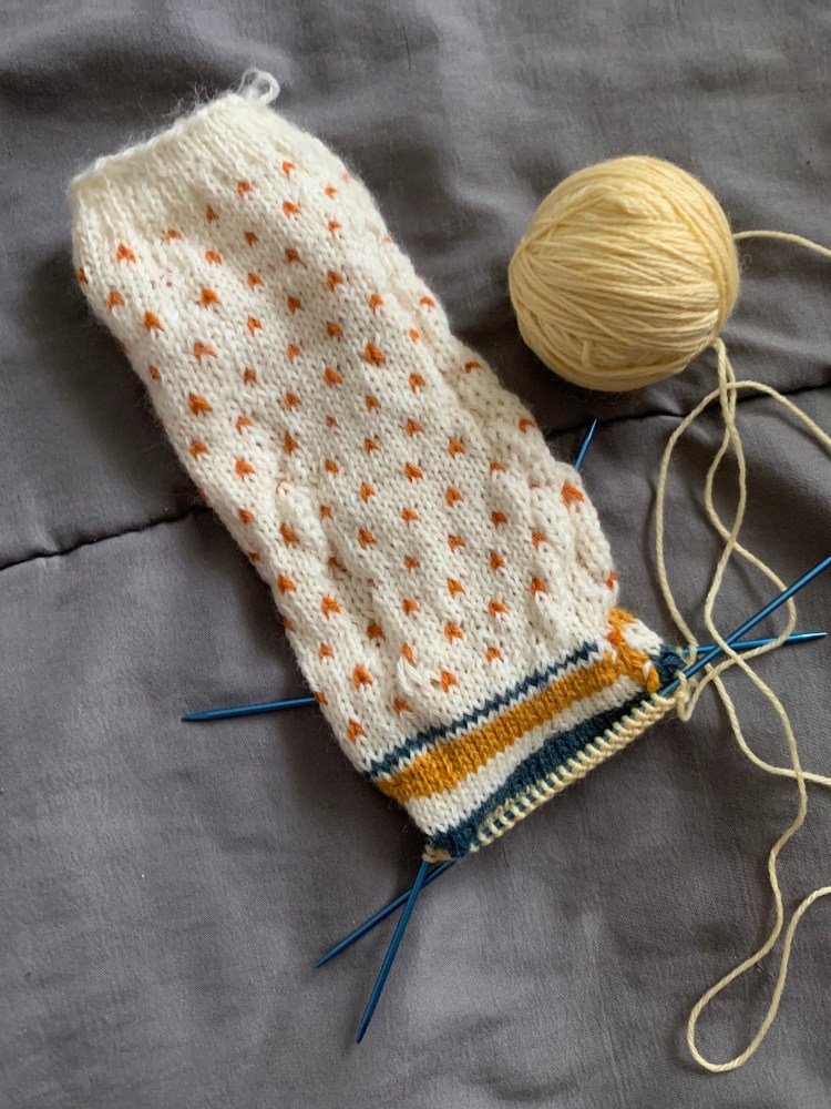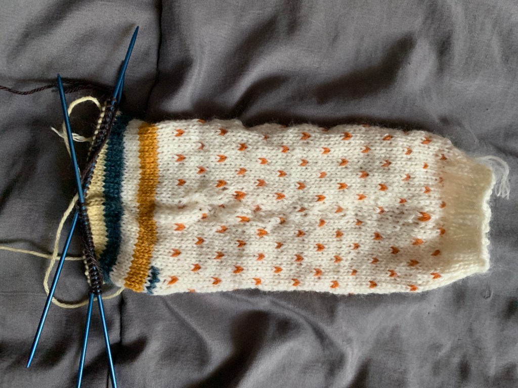 I barely worked on my socks last month. I don’t know what I had going on the two days they came up on my wheel but one day I didn’t work on them at all and the other day I gave them maybe 20-30 minutes. So not a lot of progress. I’m liking how the colors are all looking and I think my tension is getting better on the DPN’s.