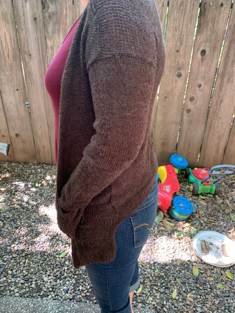My first finished garment! It isn’t perfect but I’m so proud of it and I can’t wait for Fall to roll around so I can start wearing it. My cardigan ended up being more of a flyaway cardigan because I somehow made the two front panels longer than the front. The pattern doesn’t specify if it is for a beginner or intermediate knitter but I think you should be a pretty confident knitter to attempt this pattern because not a lot is explained. My sleeves came out pretty well but they are supposed to have a section that is the same textured pattern that the back and pockets have but the way I interpreted the pattern I ended up knitting the whole sleeve before I got to that part. It also had no instructions on how to stitch it together so I ended up using my other cardigan pattern to help me finish this one. For a paid for pattern I would have hoped to have everything clearly explained especially since my other cardigan pattern is one that I paid for and it is extremely basic and yet has way more instructions.