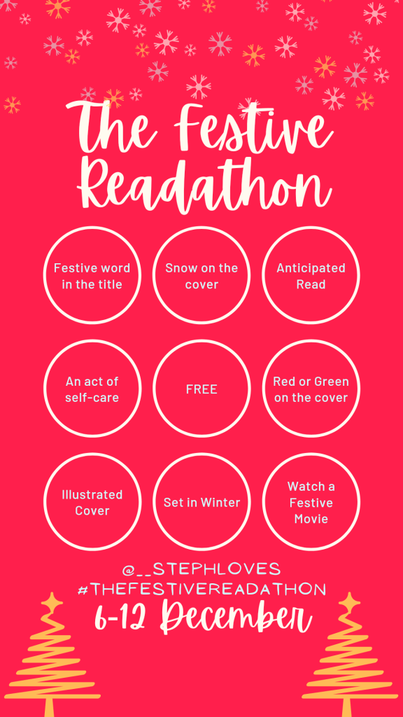 This weekly readathon is taking place next week, December 6-12, and it is being hosted by Steph from Steph Loves. I love that a couple of the prompts aren’t book related and I’m really looking forward to being extra festive next week.