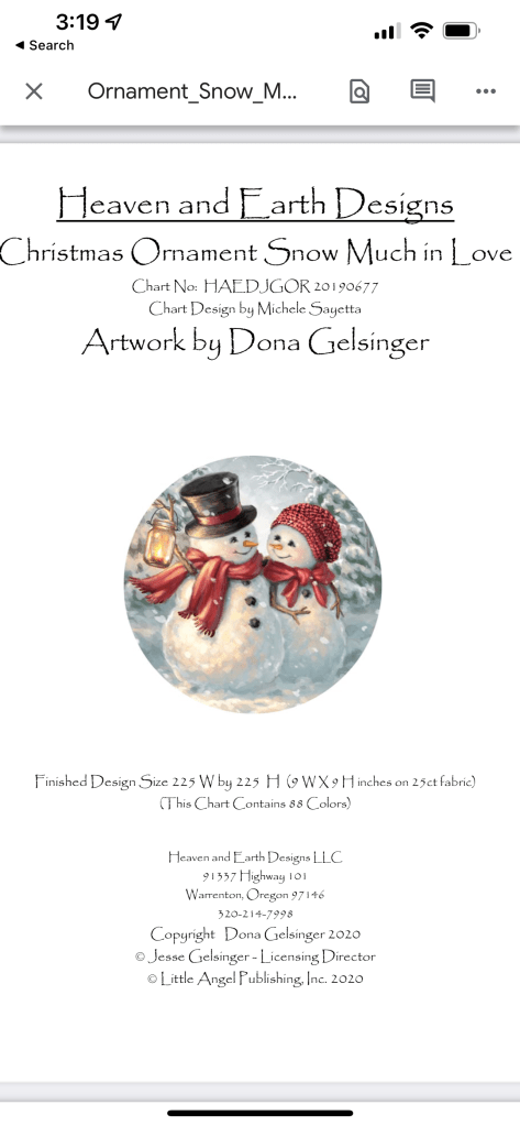 O- ornament- snow much in love. This will be a new start for me. I’m planning on stitching this on a 28ct gray fabric to make all the white stitching pop.