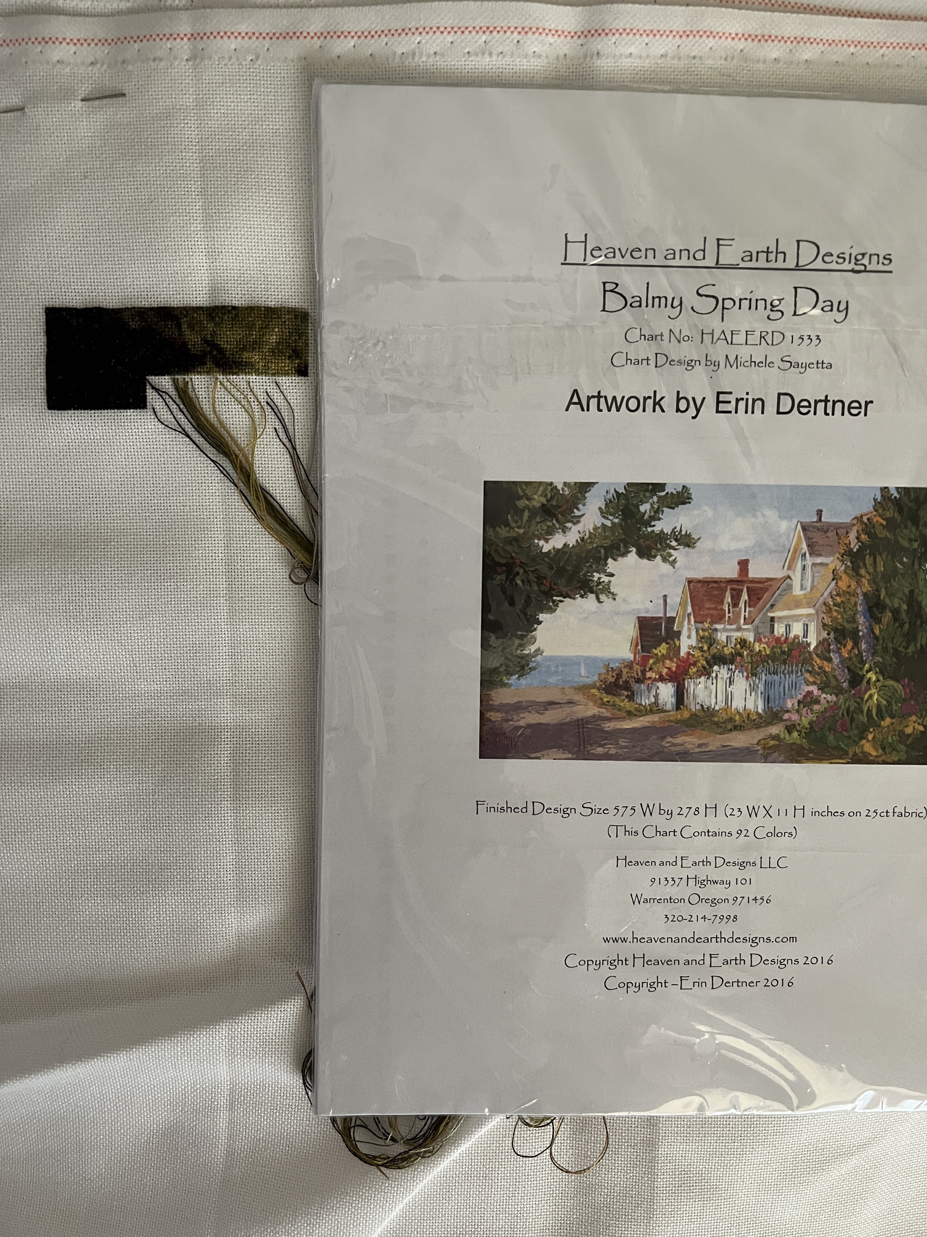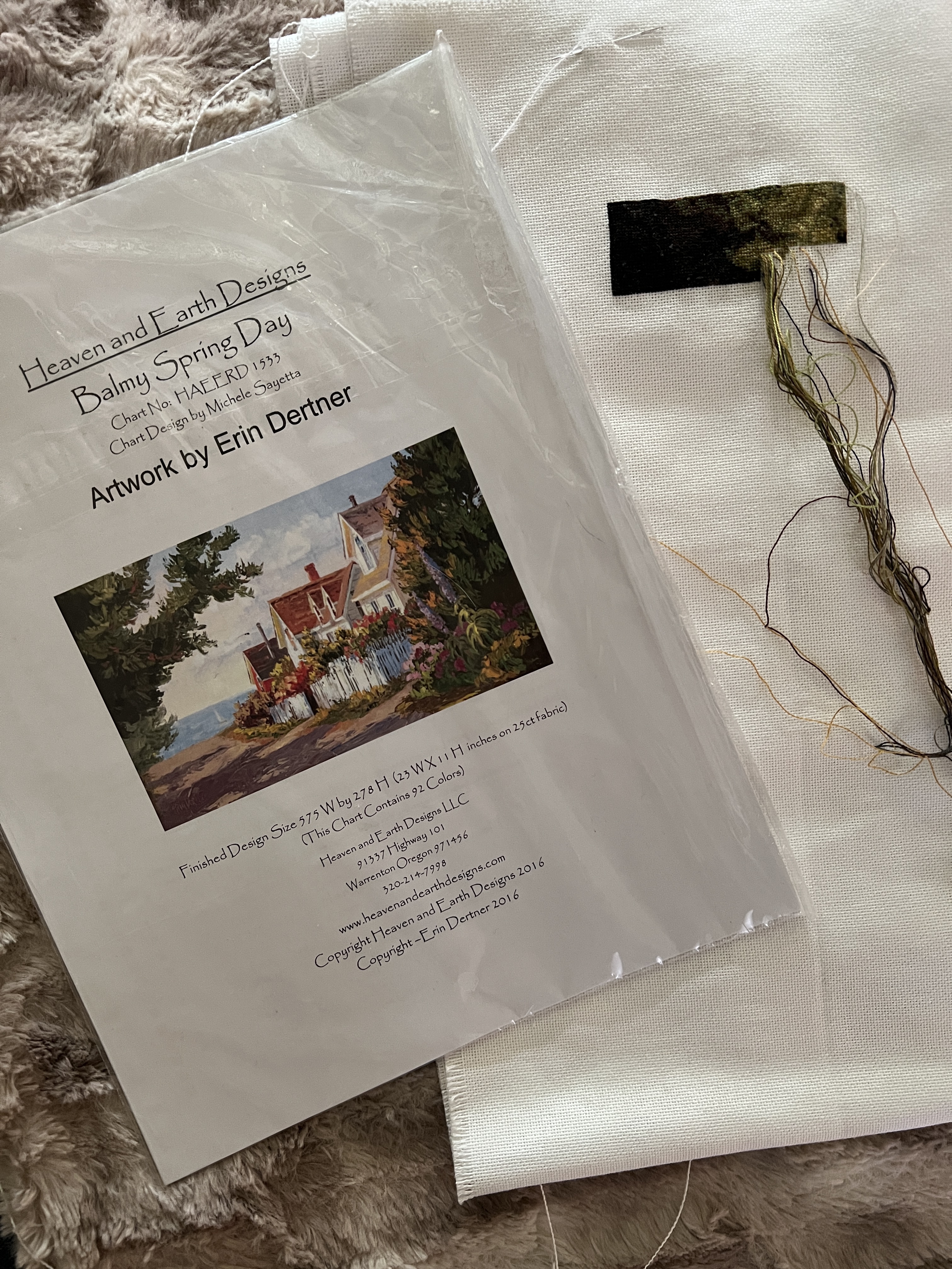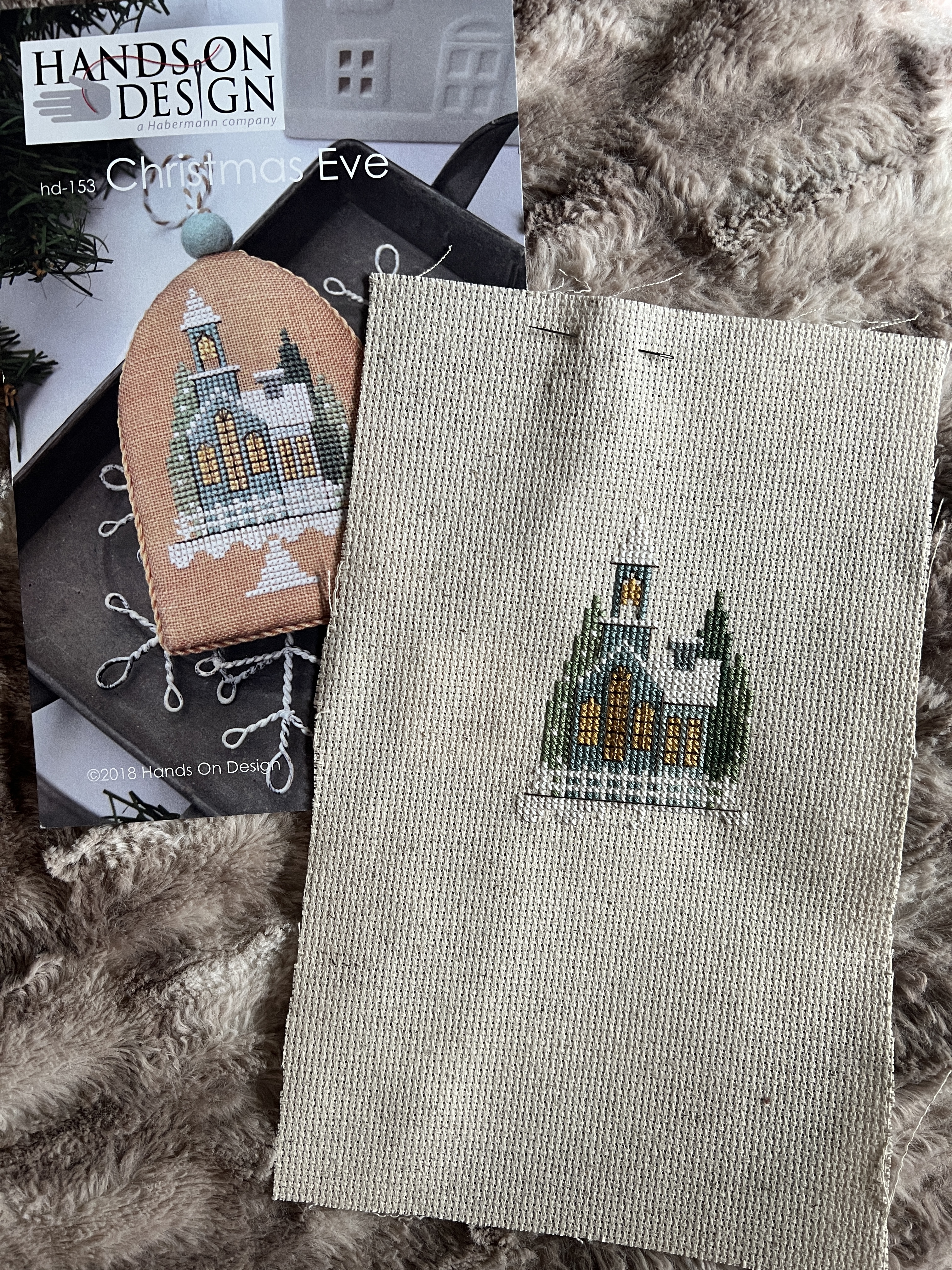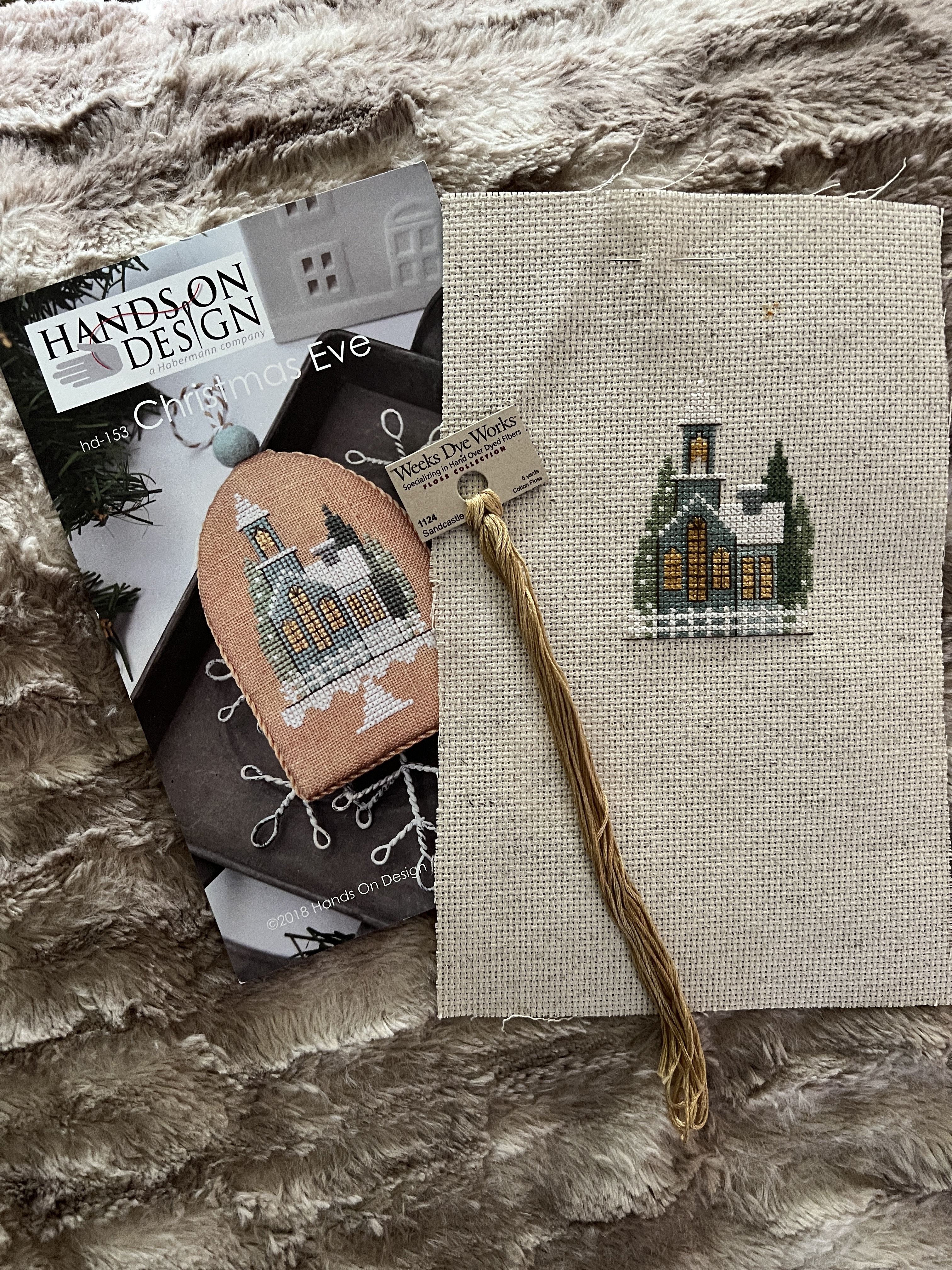 This is another WIPGO project that’s almost done. It would be done except for I decide to frog all of the white cake stand that I had stitched. The white next to the trees and buildings is easy to see but the white stand wasn’t. I’ve decided to stitch it using sandcastle by weeks dye works.